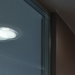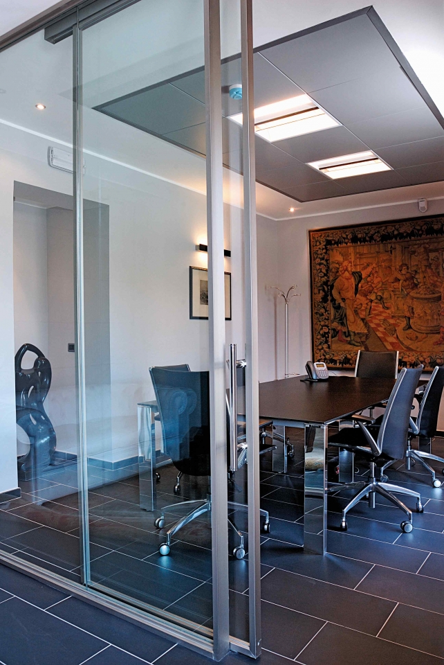 Dividere ed illuminare: partizioni in vetro extralight integrate al soffitto, profili spazzolati alluminio lucido, ante scorrevoli ad anta singola e doppia. Purezza nelle linee date dai profili ridotti al minimo della loro sezione e dall'integrazione medesima del sistema.