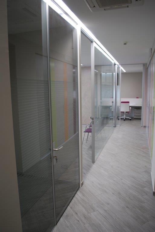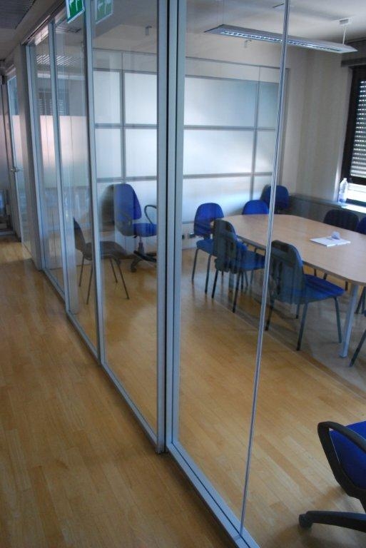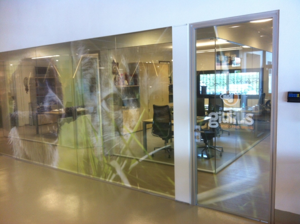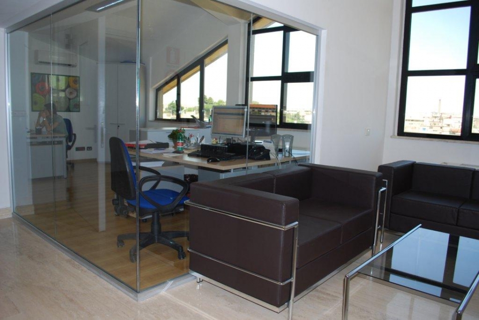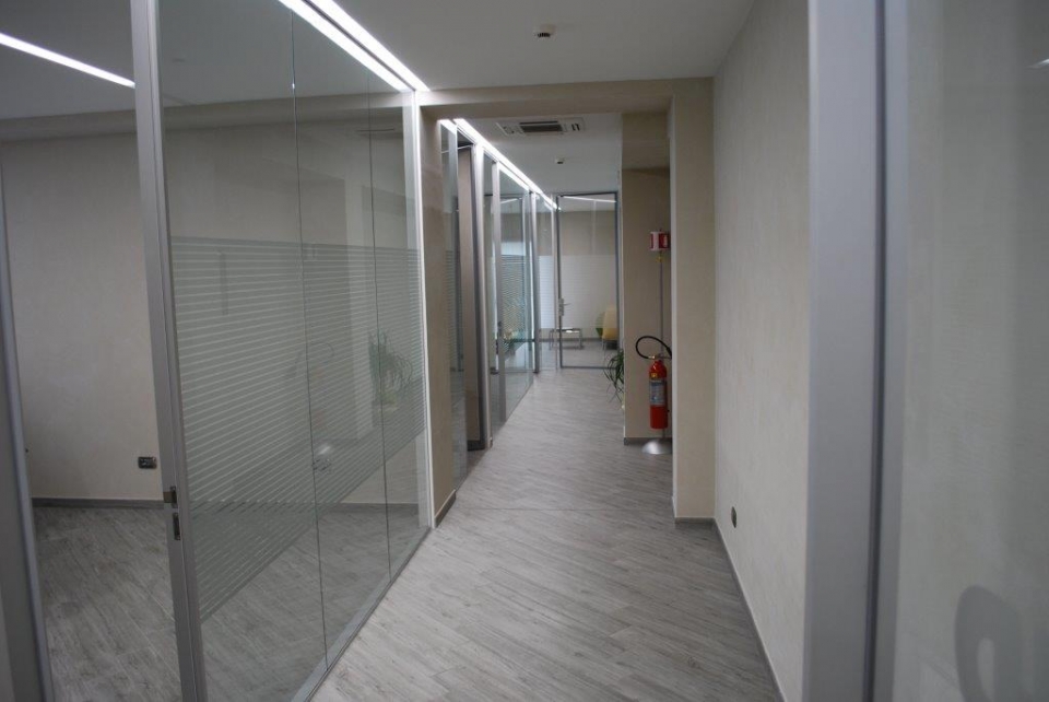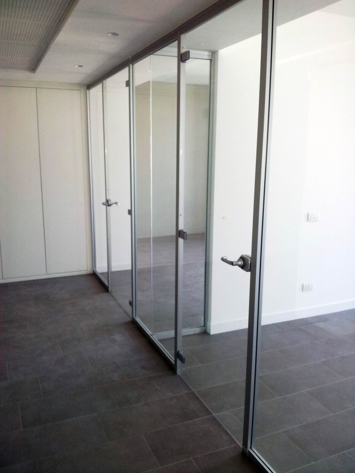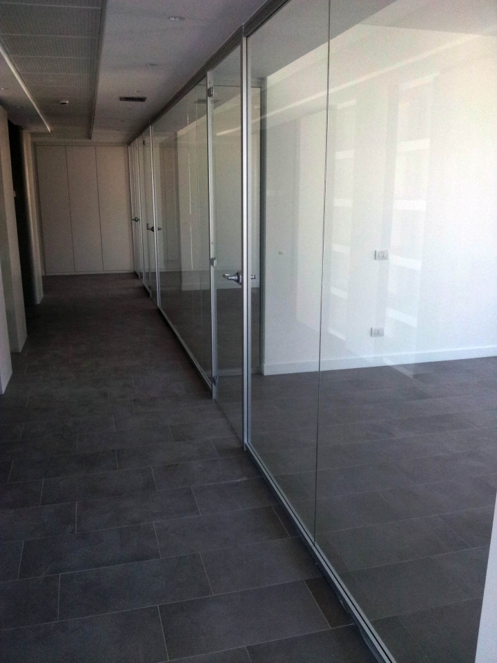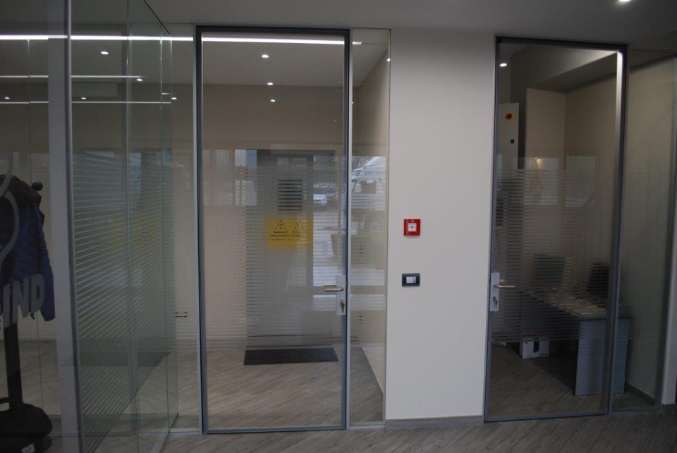 In collaborazione con lo studio Impre.do, sistema di partizione ufficio, tramite la linea TIME della Newall. Profilo esile, leggero, con sistema porte a filo lucido. Vetro stratificato 5.5.1.