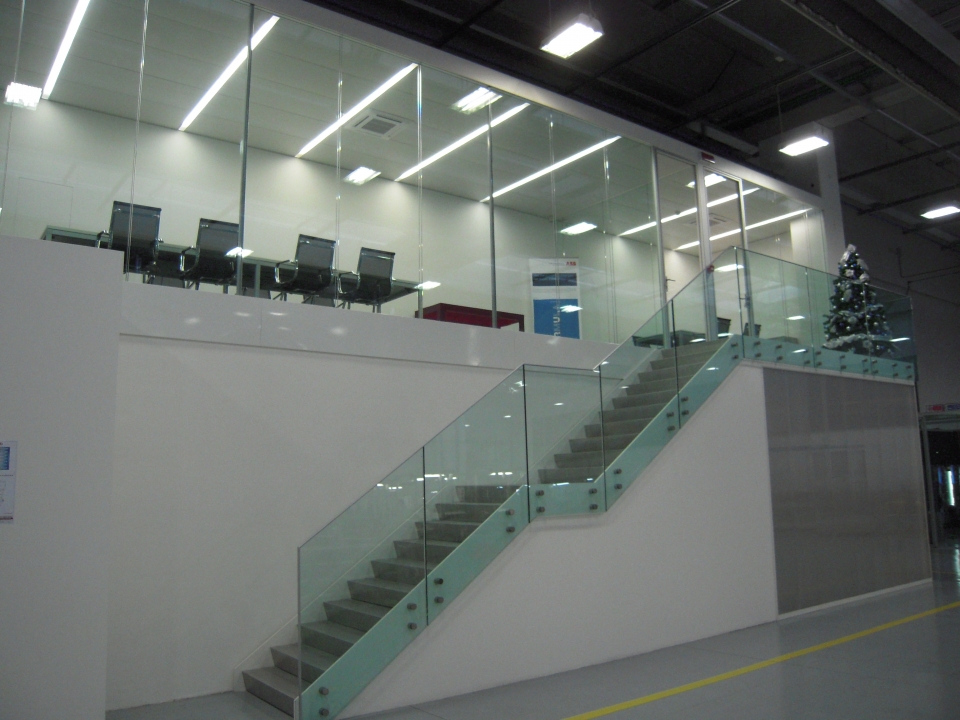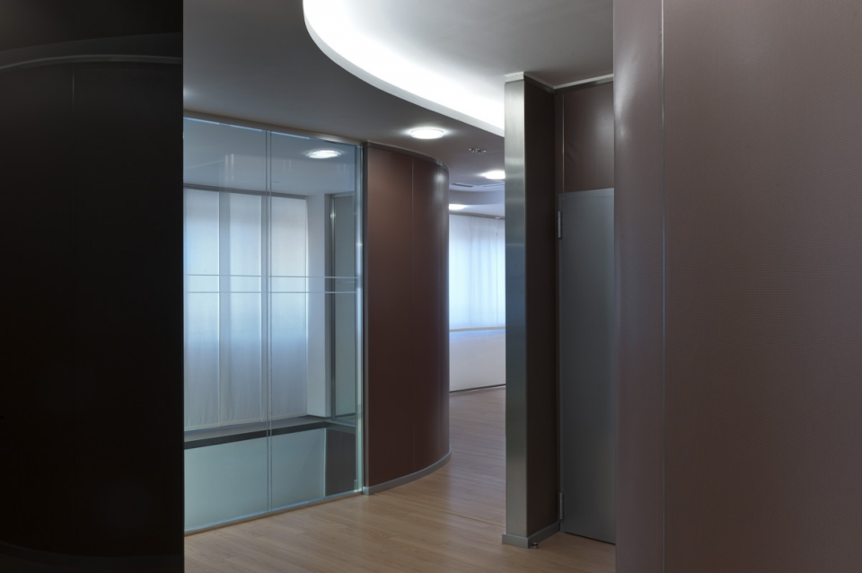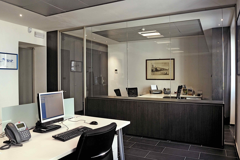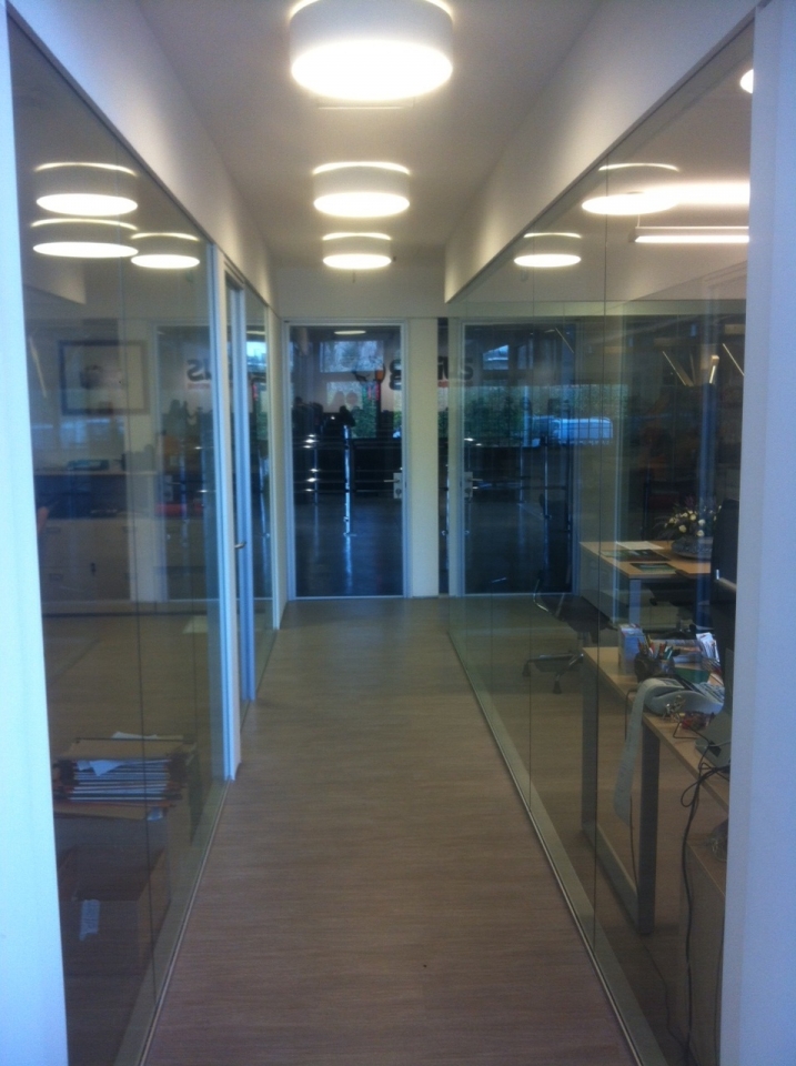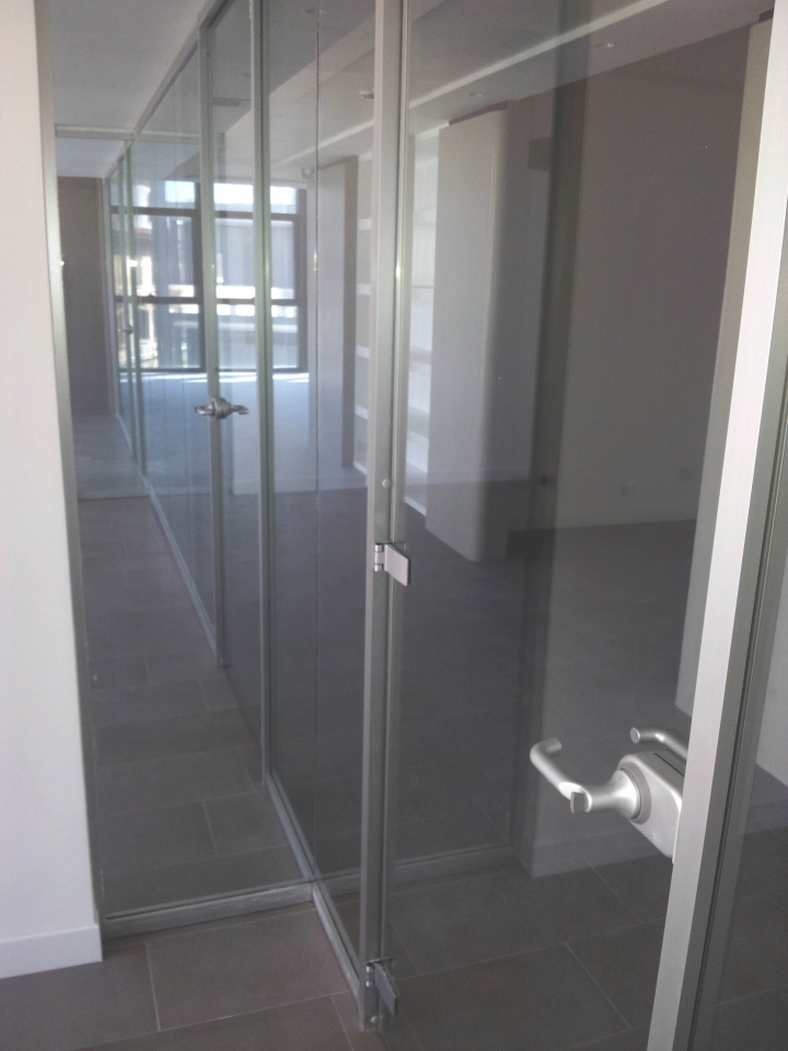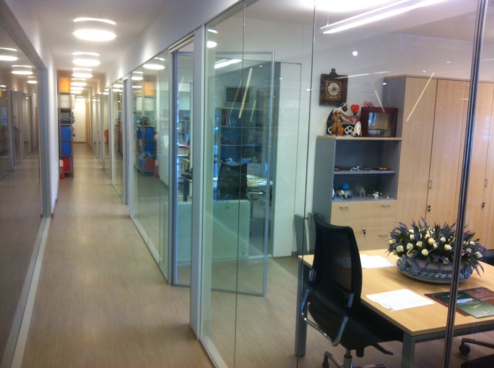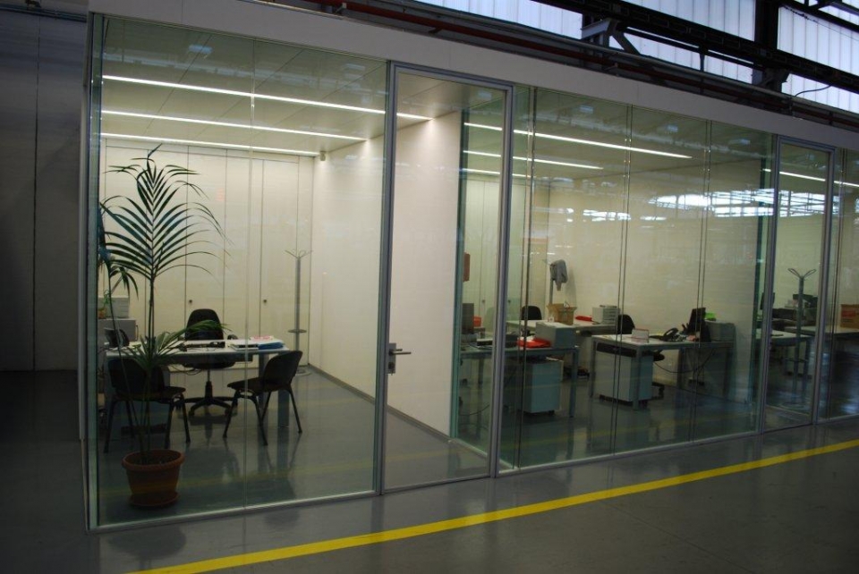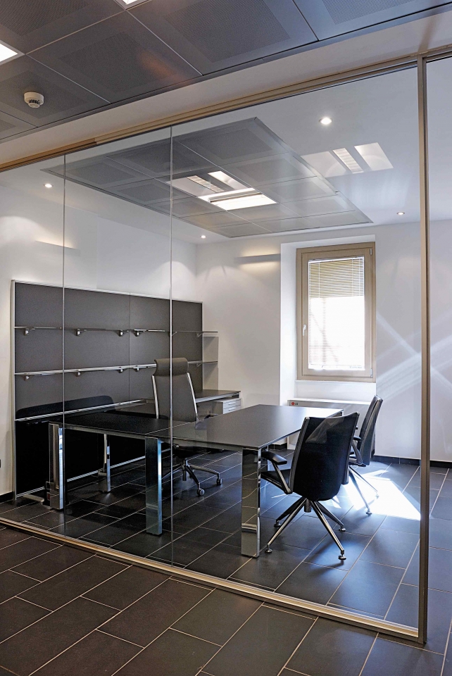 In collaborazione con lo studio Impre.do, sistema di partizione ufficio, tramite la linea TIME della Newall. Profilo esile, leggero, con sistema porte a filo lucido. Vetro stratificato 5.5.1.