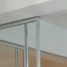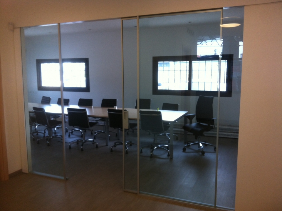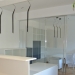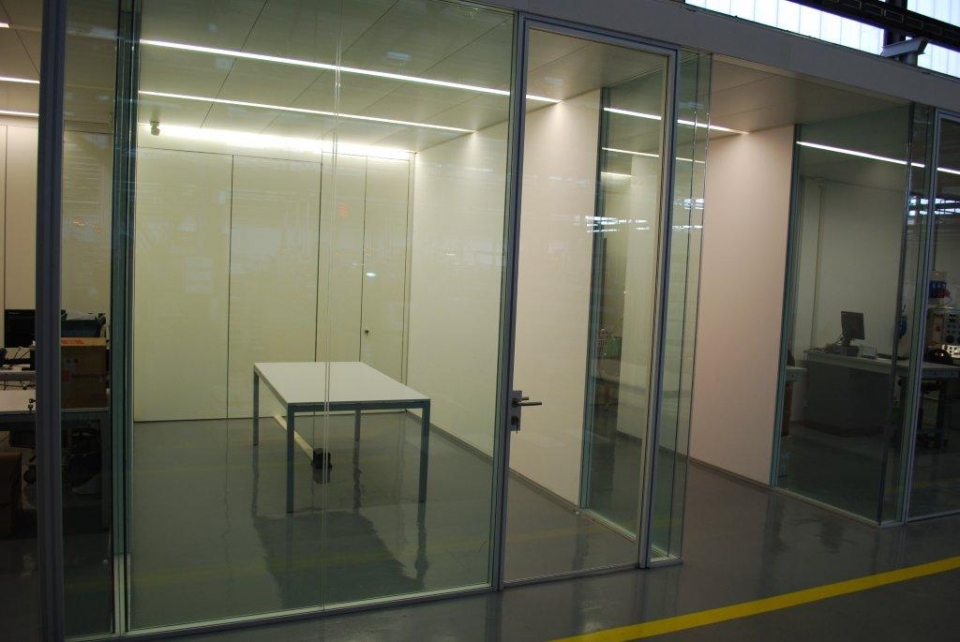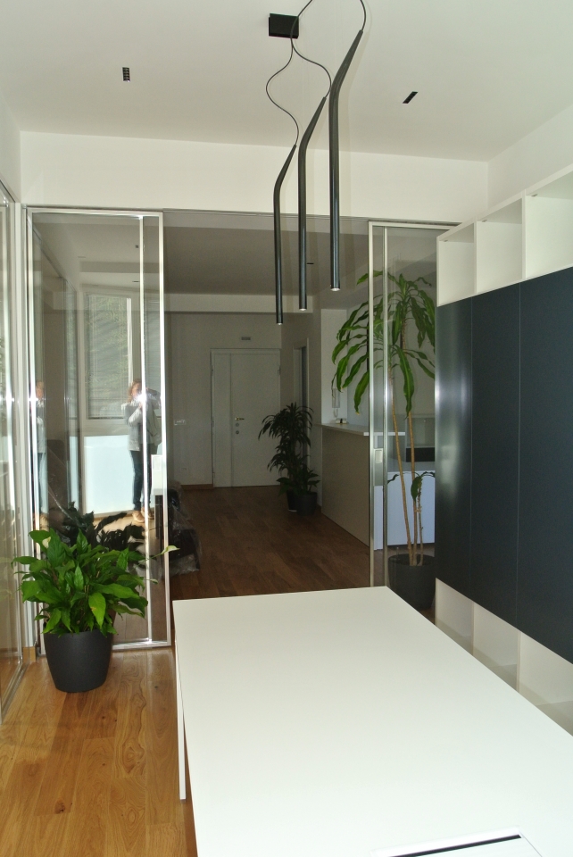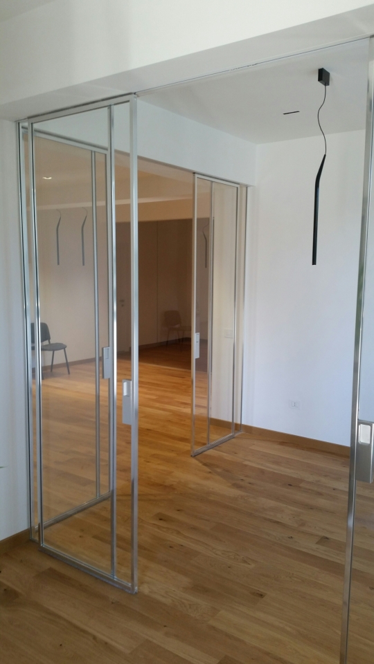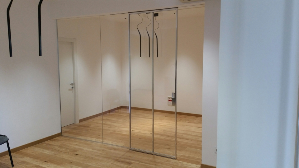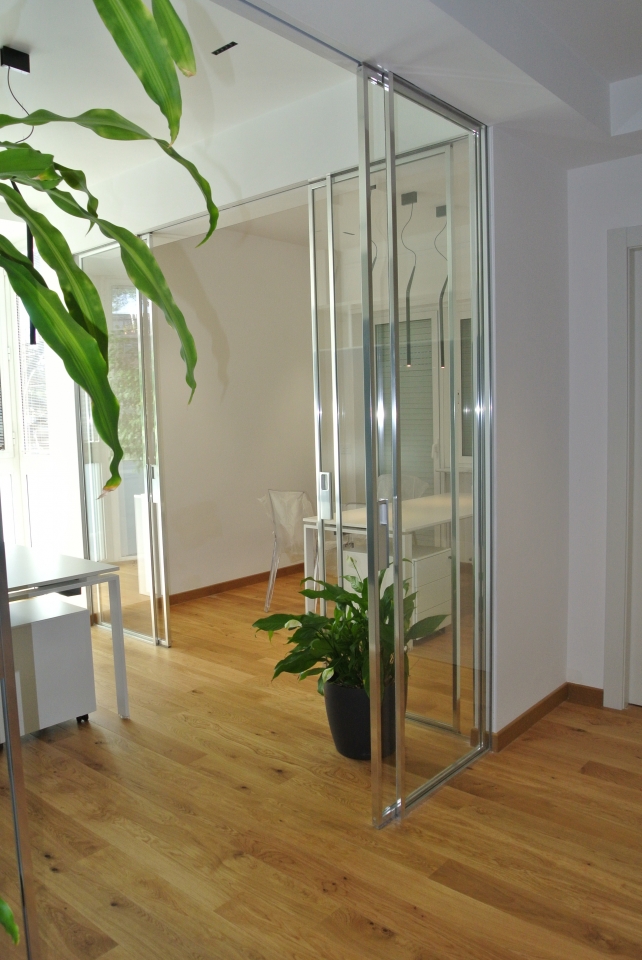 Dividere ed illuminare: partizioni in vetro extralight integrate al soffitto, profili spazzolati alluminio lucido, ante scorrevoli ad anta singola e doppia. Purezza nelle linee date dai profili ridotti al minimo della loro sezione e dall'integrazione medesima del sistema.